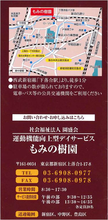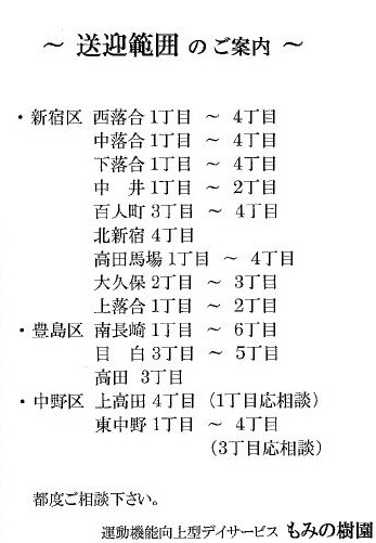 デイサービス 空き 新宿区 中落合(介護・リハビリ ライフ応援)サイト![デイサービスセンター もみの樹園]2017年8月1日より新規開設しました( もみの樹園内 1 階 ) 「新宿区 西落合」の皆様、新規入所募集中です。 スタッフ一同 心よりお待ち ... |